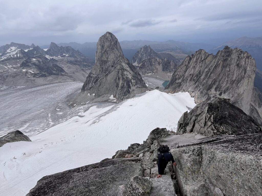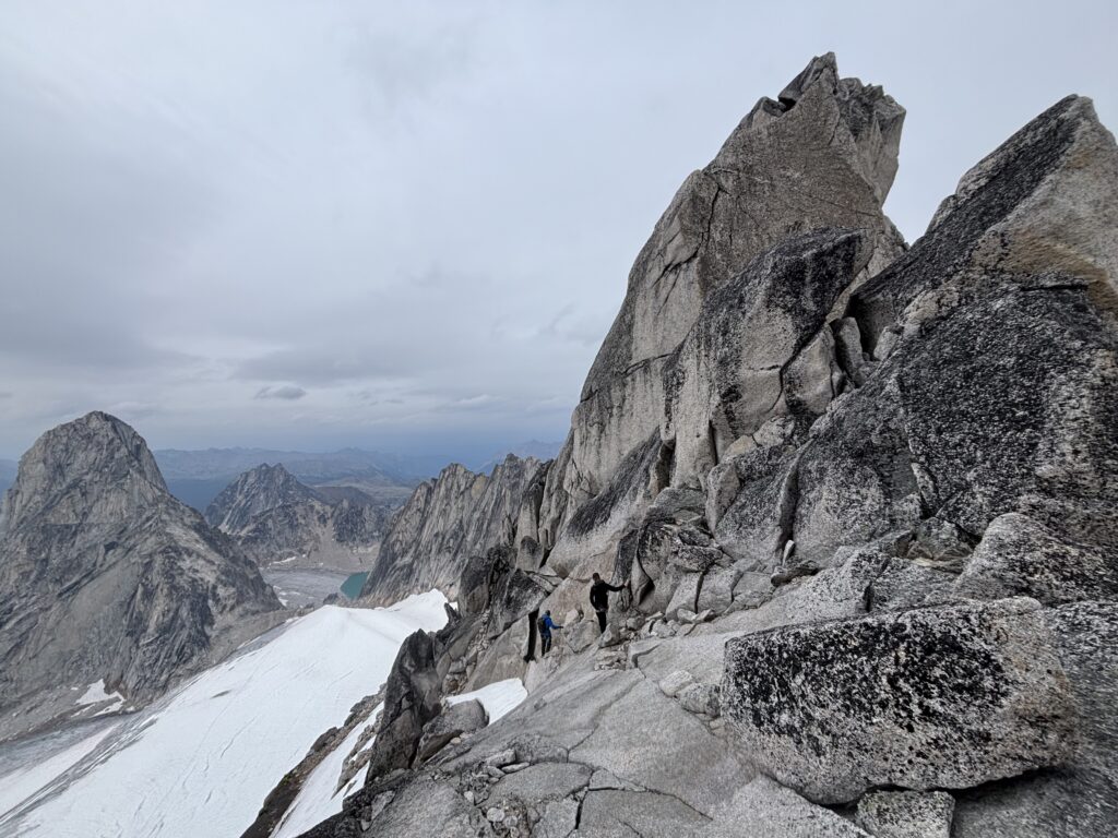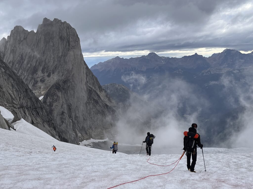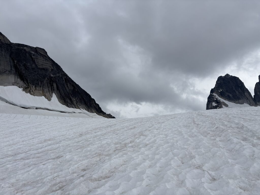 As we descended we passed throngs of people booting up to climb Pigeon Spire. No less than 10 parties and perhaps even 15 were vying for the top. Notably, most parties were not roped up for the glacier, with it’s hidden or weak snow bridges, but were carrying a full rack to climb the summit. Somehow the priorities felt wrong, but everyone has their own risk levels and comfort zones. We felt it was prudent to rope up for the glacier and stayed tied in until the dry basin below.