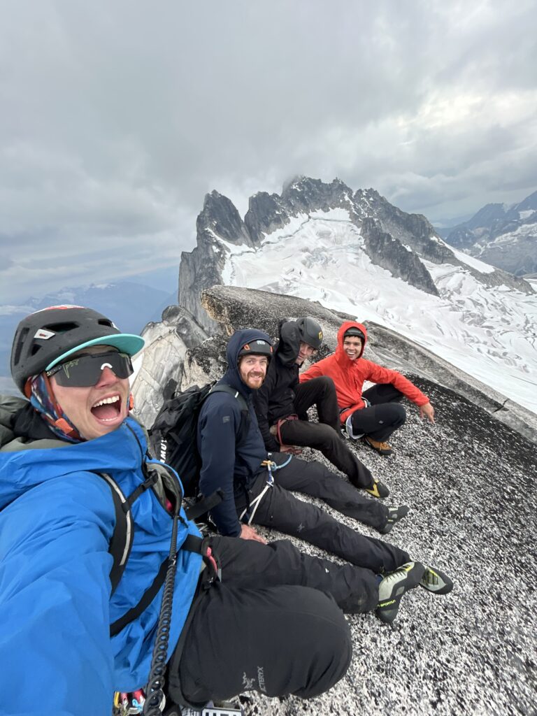 Most of the route involved fun scrambling interspersed with the occasional low 5th moves and the two cruxes came right at the end. The first as a short down climb into the last notch below the summit and the second was a 5.4 off-width crux to gain the upper ramp system to the top. Both were reasonably managed and we all stood on the summit after 35 minutes of rambling.