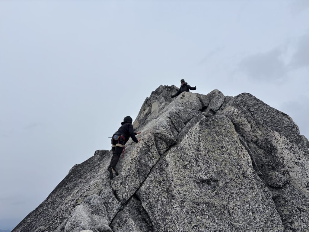 Geoff, Nathan, Brayden and myself had just completed a climb up Snowpatch Spire and were enroute back to camp. There was still some time in the day and despite the brooding clouds we thought we might as well try a quick climb up Pigeon Spire. We were the only group around when we reached the base of the climb. I’d later find out this is a rarity. From what I can gather Pigeon Spire is normally a bit of a circus with lines of climbers pitching out the ridge. I mean no disrespect to anyone who aspires to climb Pigeon, but that sounds purely dreadful. In any event, we were perhaps lucky to find the ridge empty, although I’m share the lateness of the day and the threat of rain helped the cause.