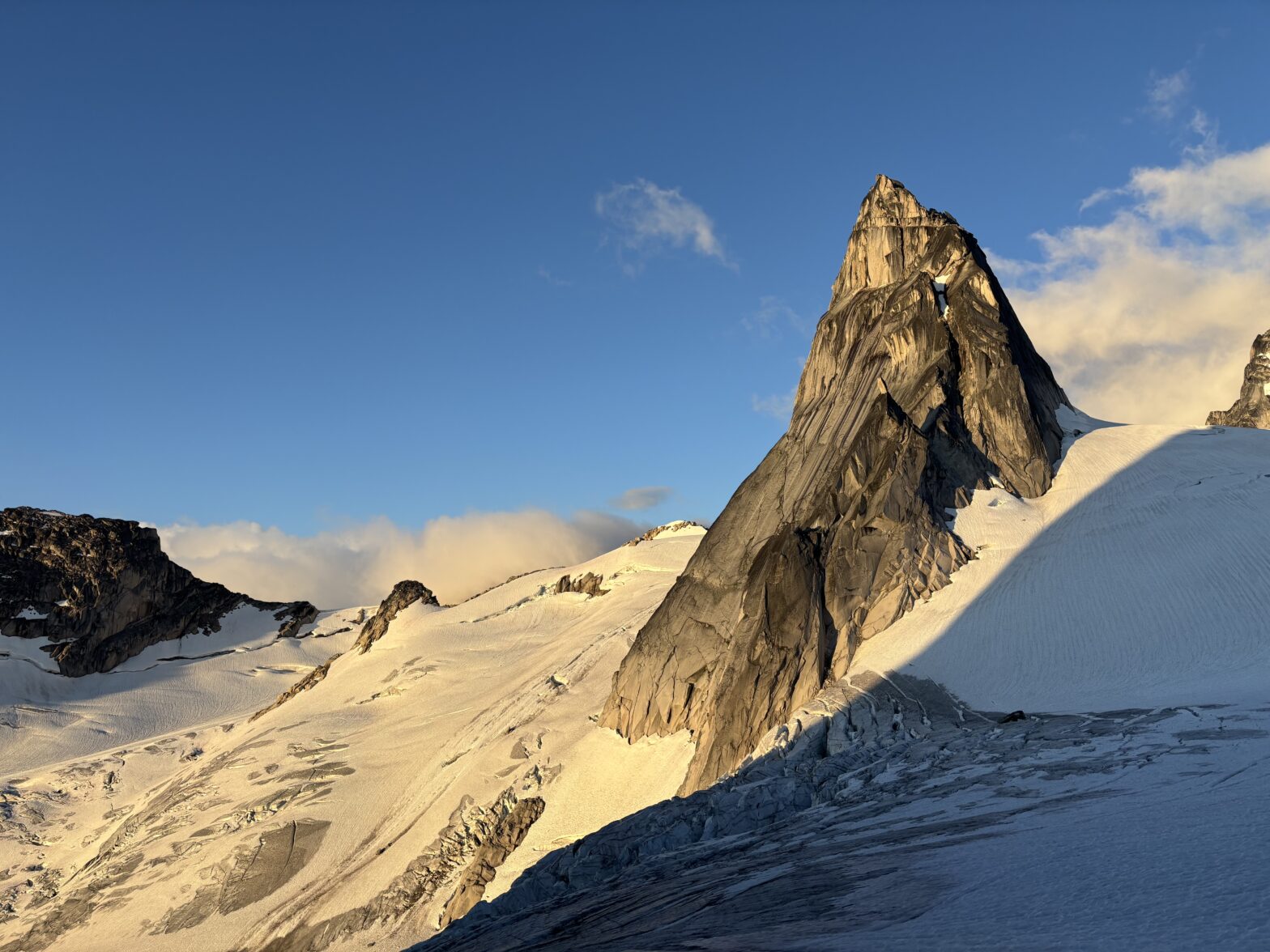 As we descended we passed throngs of people booting up to climb Pigeon Spire. No less than 10 parties and perhaps even 15 were vying for the top. Notably, most parties were not roped up for the glacier, with it’s hidden or weak snow bridges, but were carrying a full rack to climb the summit. Somehow the priorities felt wrong, but everyone has their own risk levels and comfort zones. We felt it was prudent to rope up for the glacier and stayed tied in until the dry basin below.