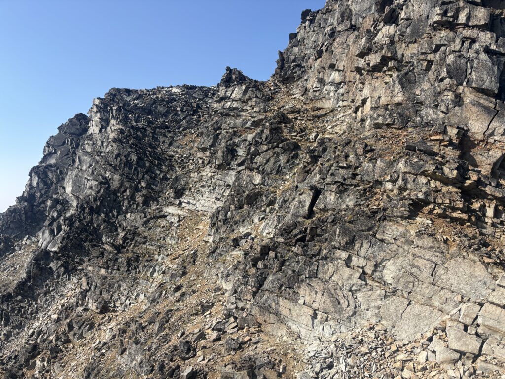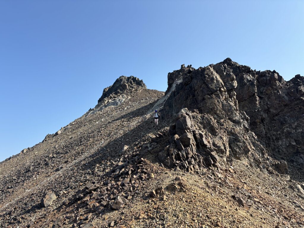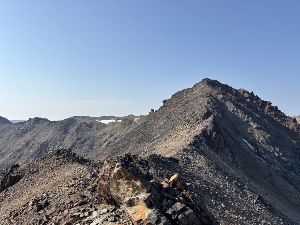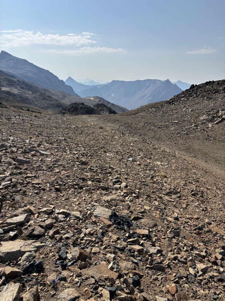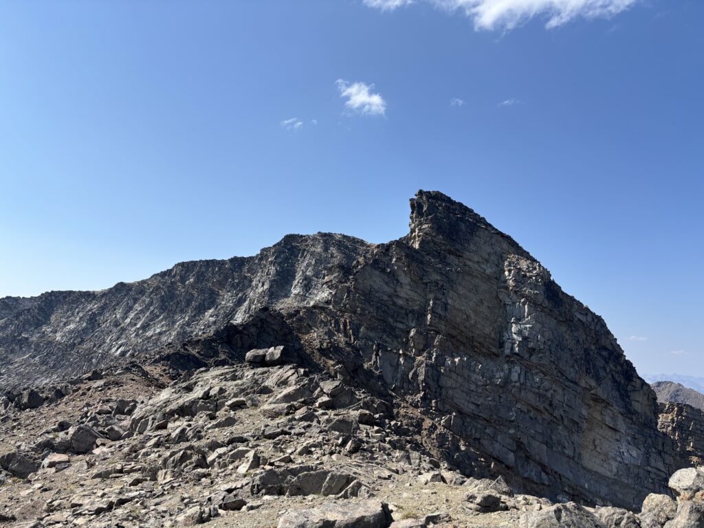 We were finally headed to Truax after a pleasant stop on the summit of Stamp Peak. The first order of business was losing some elevation off of the summit of Stamp. The descent didn’t exceed 2nd class and we sound found ourselves back on the ascent, trudging up scree. Once we we over this first hump, we had beautiful open rolling terrain. We climbed up to another high point where massive leaning cairn marked nothing in particular and then dropped down the other side. Here we had to scramble down some 3rd class benches to gain a gully below and that connected us with the tame southwestern aspect of Truax.