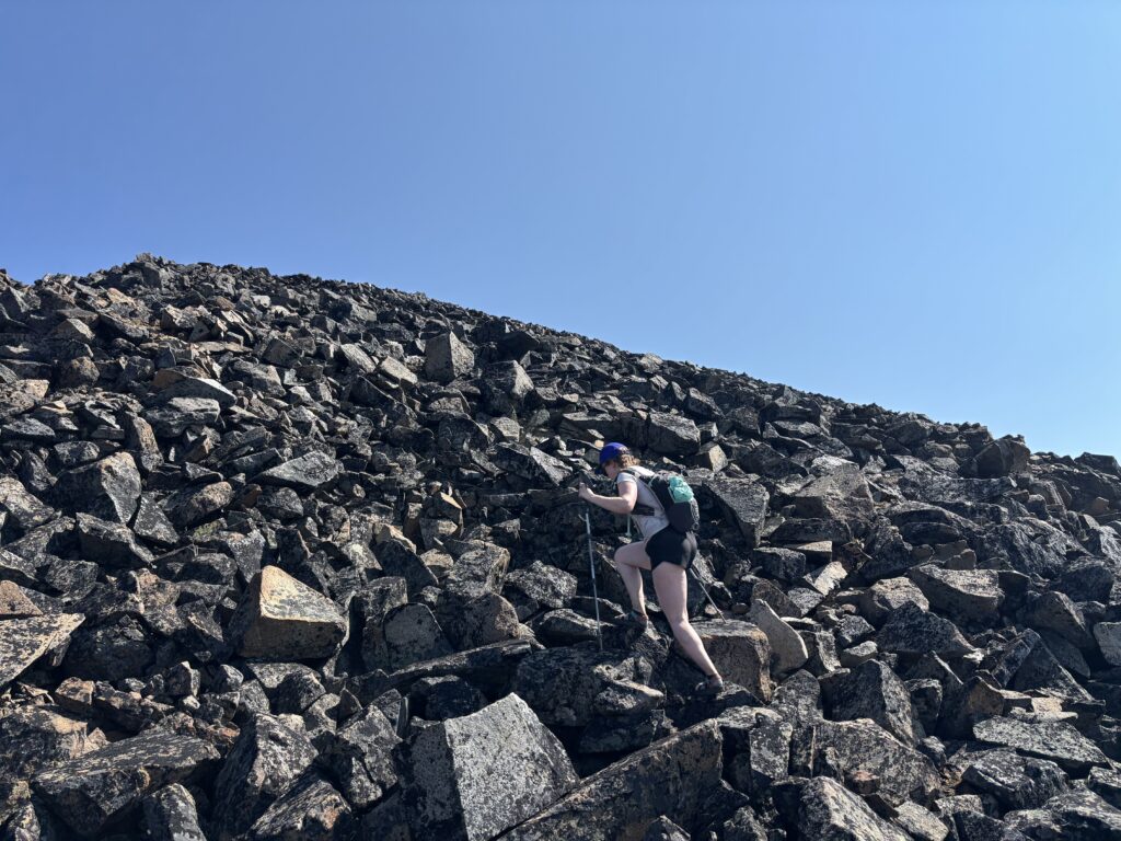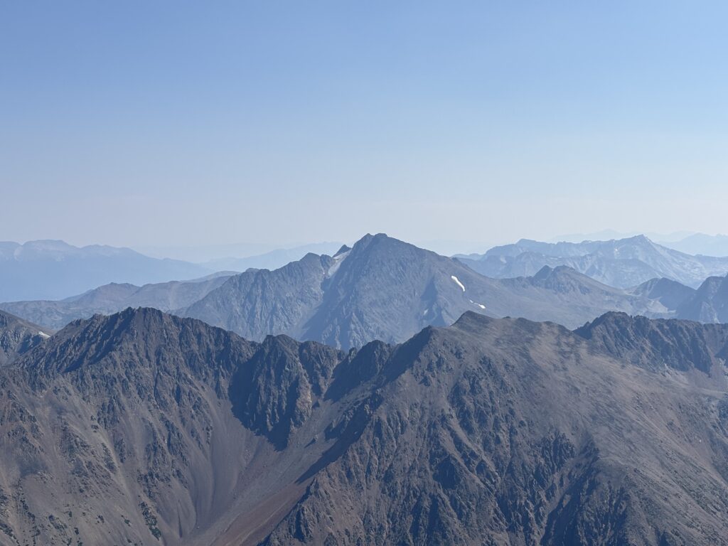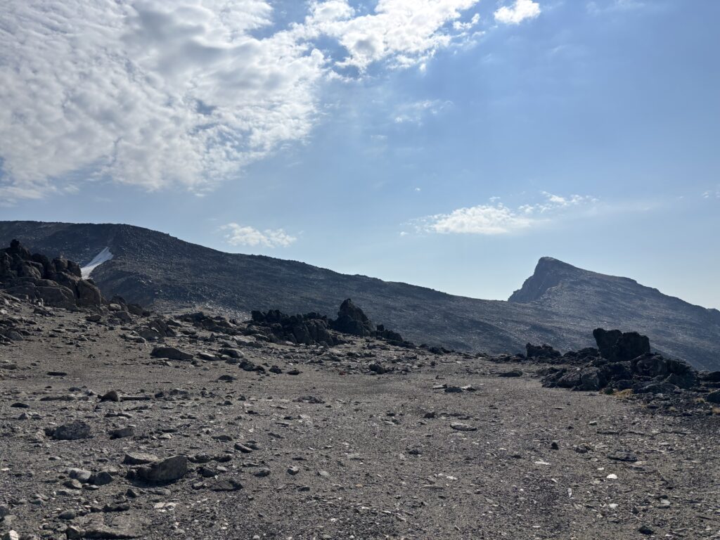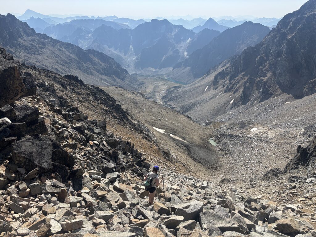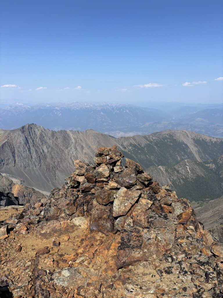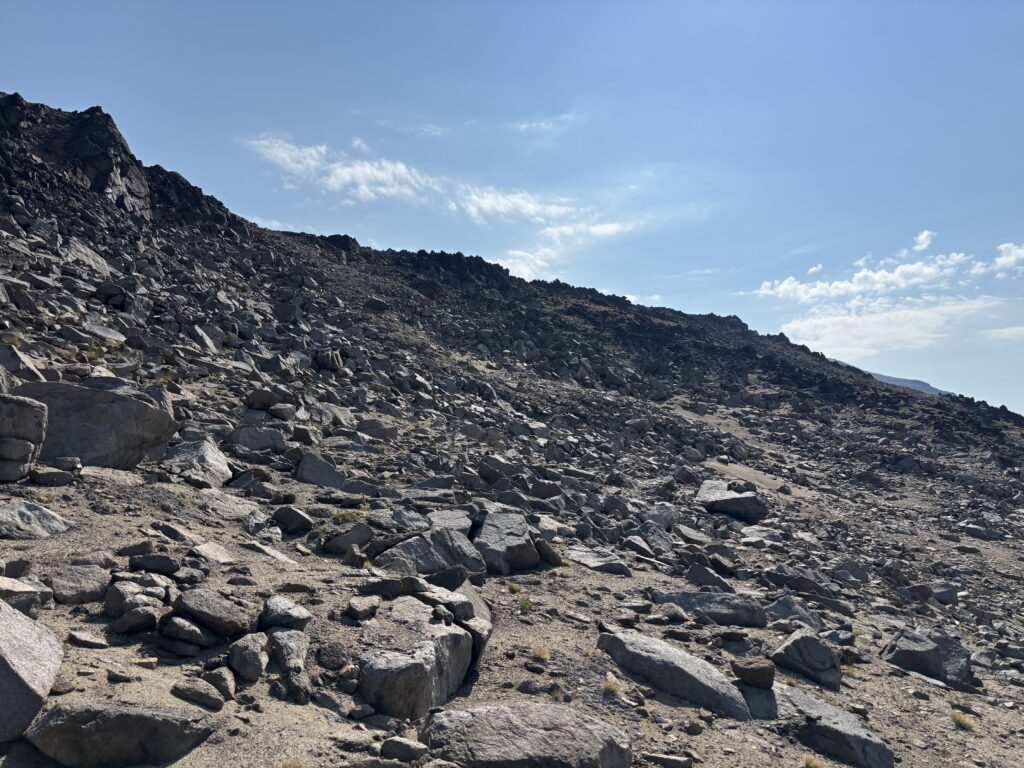 We were finally headed to Truax after a pleasant stop on the summit of Stamp Peak. The first order of business was losing some elevation off of the summit of Stamp. The descent didn’t exceed 2nd class and we sound found ourselves back on the ascent, trudging up scree. Once we we over this first hump, we had beautiful open rolling terrain. We climbed up to another high point where massive leaning cairn marked nothing in particular and then dropped down the other side. Here we had to scramble down some 3rd class benches to gain a gully below and that connected us with the tame southwestern aspect of Truax.
