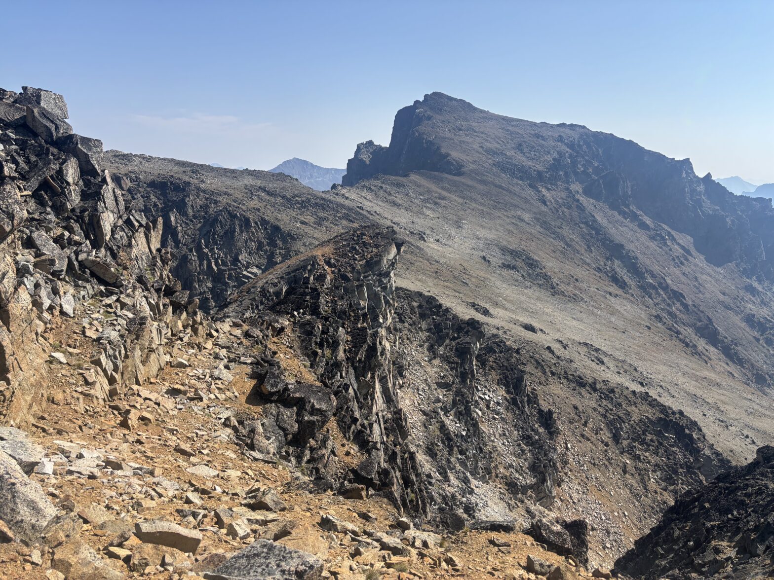 We were finally headed to Truax after a pleasant stop on the summit of Stamp Peak. The first order of business was losing some elevation off of the summit of Stamp. The descent didn’t exceed 2nd class and we sound found ourselves back on the ascent, trudging up scree. Once we we over this first hump, we had beautiful open rolling terrain. We climbed up to another high point where massive leaning cairn marked nothing in particular and then dropped down the other side. Here we had to scramble down some 3rd class benches to gain a gully below and that connected us with the tame southwestern aspect of Truax.