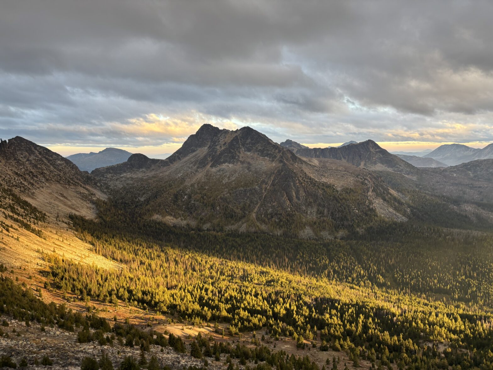 To the west and south stood the broad expanse of the Pasayten Wilderness. The forests looked sickly or burned and this did not strike me as pleasant terrain to ramble through. A ways to the west I could see Sheep Mountain, an area I’d been to some 3 years prior. Further south some interesting looking summits in the states caught our eye too. We’d later find out that one peak in particular: Cathedral Peak boasts an all time class 5.9 route. Something to see in the future!