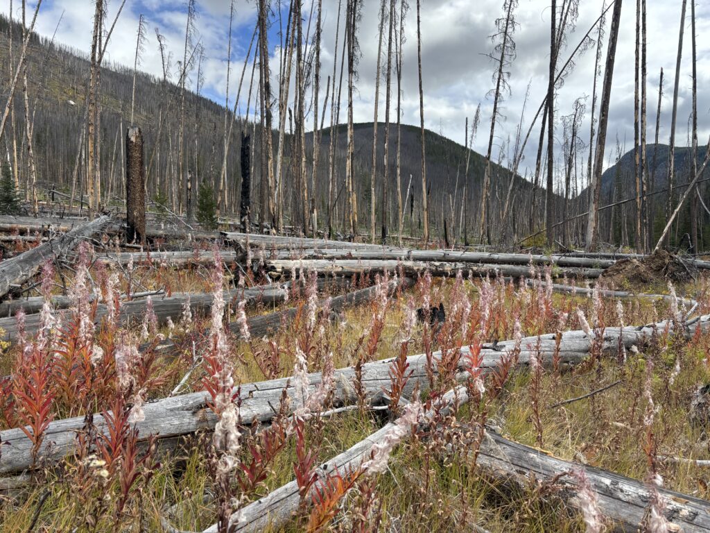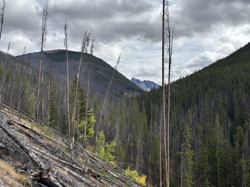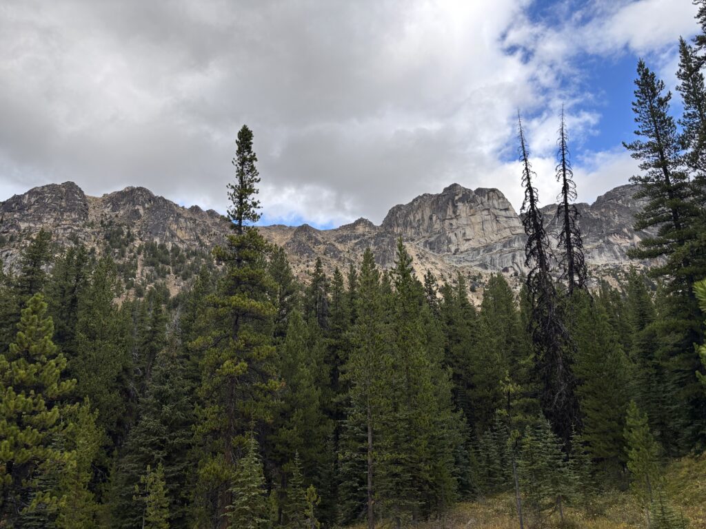 For the next few kilometers we hit a menagerie of deadfall, burned forest, swamp and occasional sections of open terrain. It was generally left something to be desired. Finally around the twelfth kilometer the forest changed to more open meadows and we meandered through more pleasant terrain. There was one particular nice section of meadows at around 2070m where we elected to establish camp. We had 5 star views of Grimface and the traverse.
