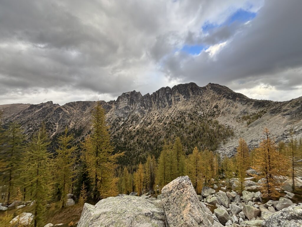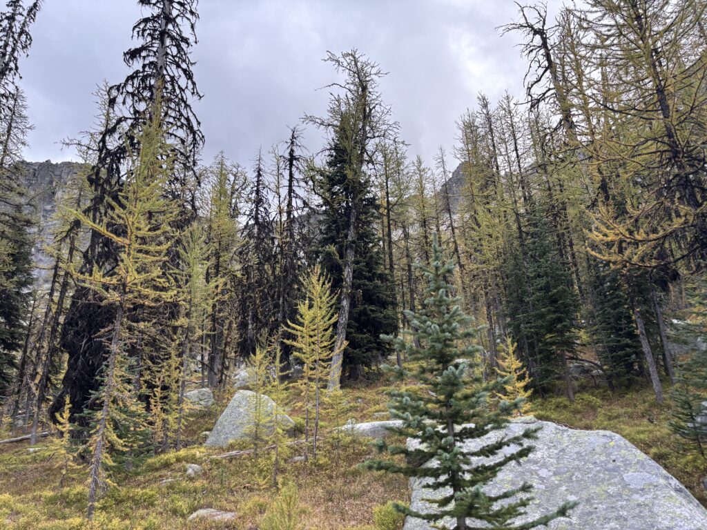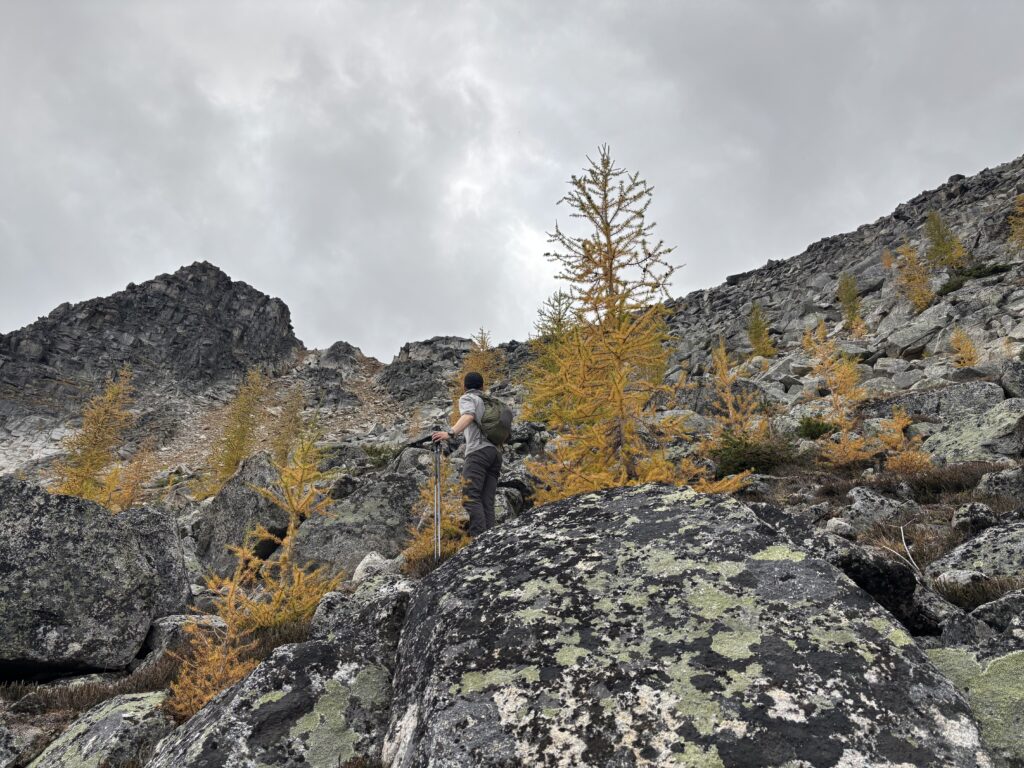There was still 2.5 hours to sunset and I had some gas in the tank so I through out The Deacon as an idea. Alex was on board and we could already see an easy enough line up to the summit. We quickly gathered a minimal set of gear and headed for the north east face of The Deacon, directly west of the Decaon-Matriarch col. Larches dotted the steep slopes here and we paused to take in the surrounding landscape now framed by golden hues.