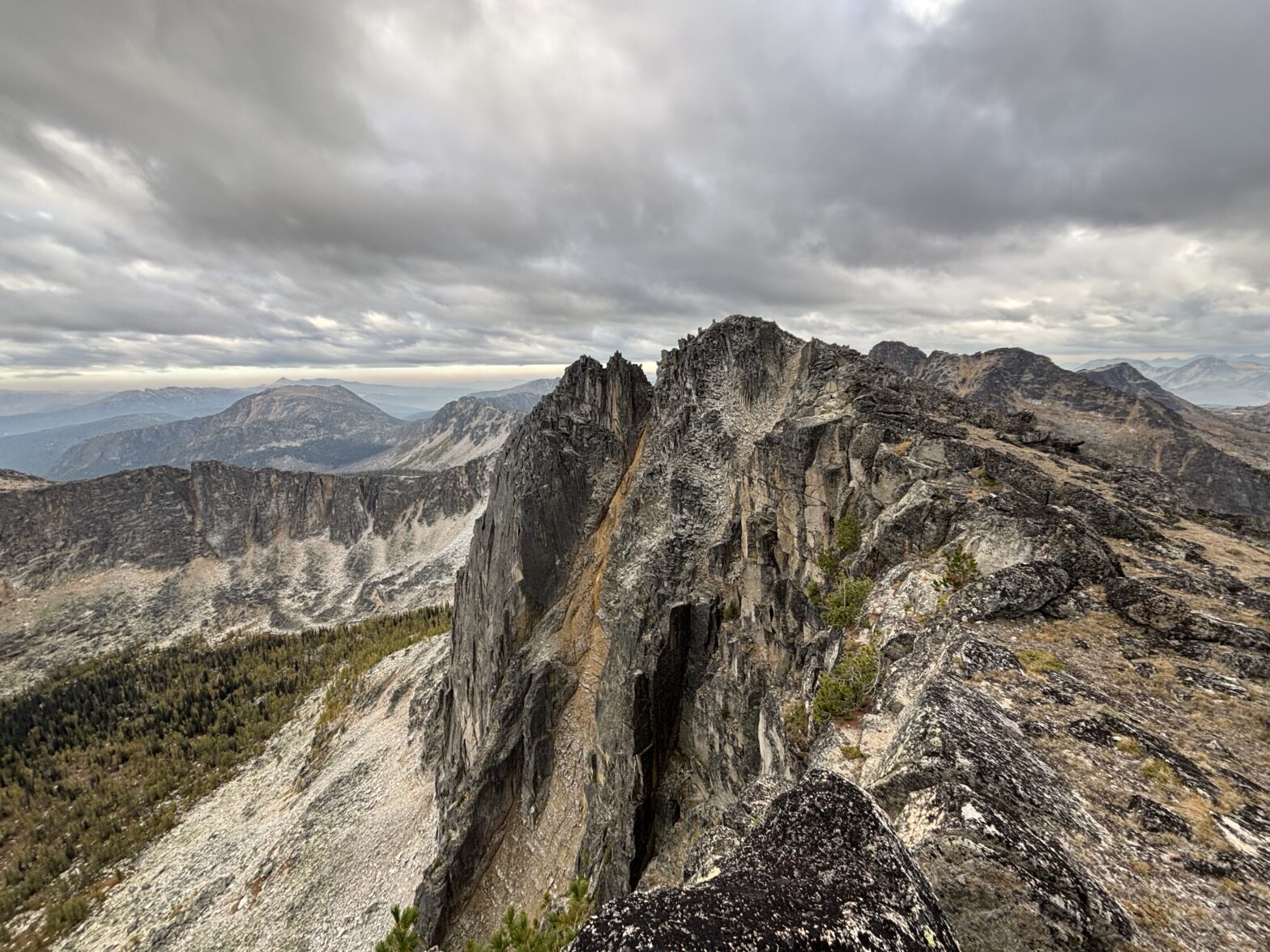 Throughout the years talk of climbing in the Cathedral Park area has come and gone within my friend circles. It’s a rather interesting group of summits with some supposedly phenomenal climbing. It also marks the eastern most extent of Matt Gunn’s scrambles of SWBC and many scramblers and climbers come to do the highest summit: Grimface Mountain alone. In recent years a fire swept through the area and that’s left access to the lodge in limbo while trails are ridden with deadfall or not accessible at all. Finally in 2025, the area saw some revitalization with a new bridge starting construction and a clean sweep of many of the trails. That was a convenient change of course for Alex and I, as we were planning a two objective and Alex happened to suggest Cathedral. Specifically, he wanted to do the Matriarch-Macabre-Grimface traverse. This is a popular route that goes at 5.7 A0 and involves a fun multi-summit traverse across Matriarch Mountain, Macabre Tower and then finally up to Grimface.