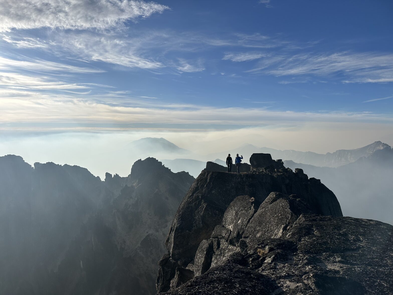 As this was transpiring, the wind had really started to pick up and fire smoke was beginning to encroach on the terrain around us. Really it was a matter of 15-20 minutes and we departed from clear skies to pure smog. In any event, we pressed on and gained the broad ridge above where we spotted Anna and Megan, the two climbers we met at the parking lot. They had actually bivied on the ridge with the intention of traversing all the way out on the highline trail instead of dealing with the deadfall ridden Wall Creek approach again. That was my lightbulb moment, realizing we could have and should have done the same.