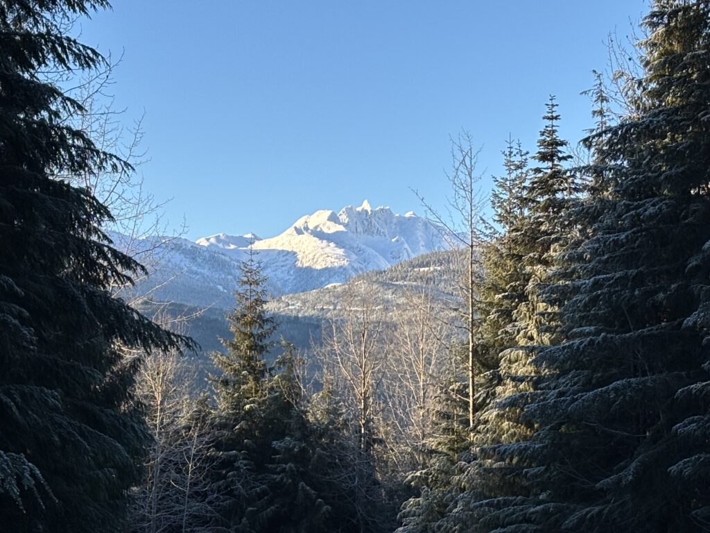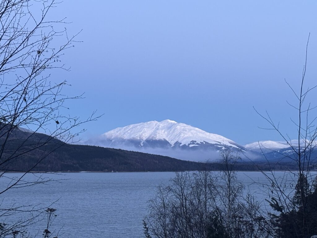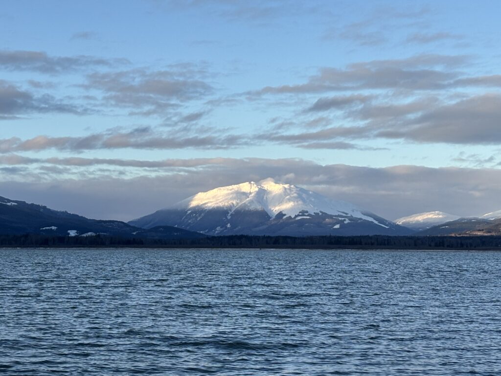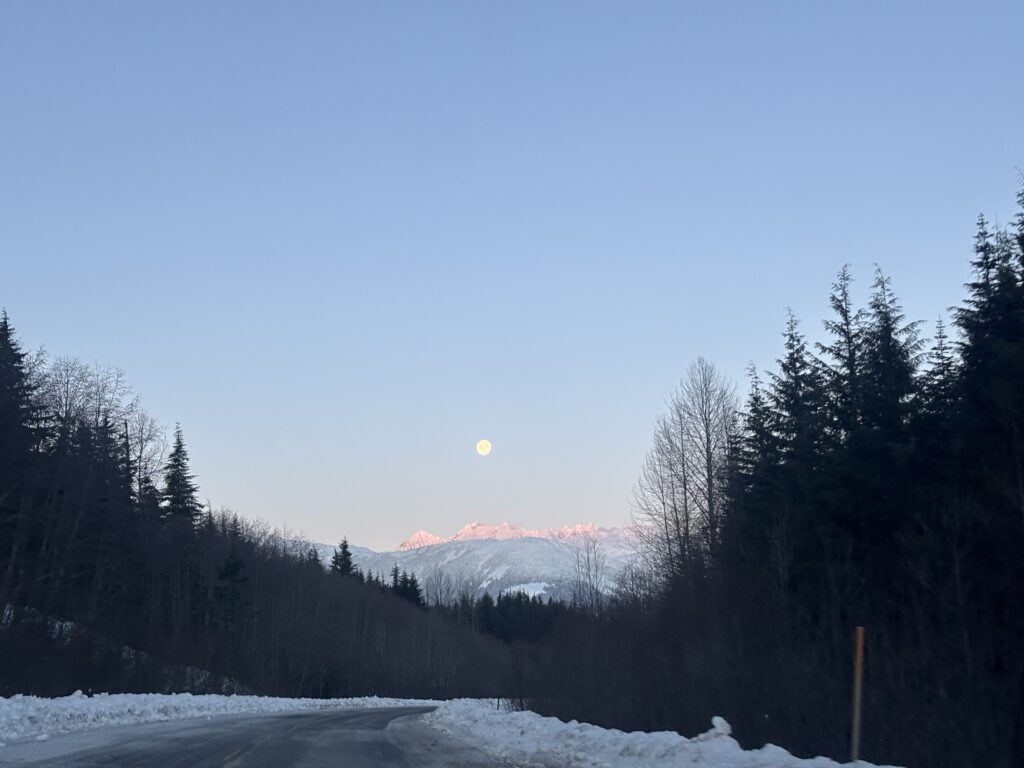 I knew nothing of the area other than it appeared remote, it was forecast to be -15 to -18 and I was a little anxious about heading out alone despite the terrain looking not all that involved. To remedy that I packed extra layers and even a -18 sleeping bag should I get marooned from an injury of some kind. The next morning I made the long but scenic drive with the sunrise commencing right as I pulled into Terrace. I continued past Terrace and Rosswood where “Sandview Peak” finally came into sight. It looked like a Chilean Volcano rising alone above Kitsumkalum Lake.
