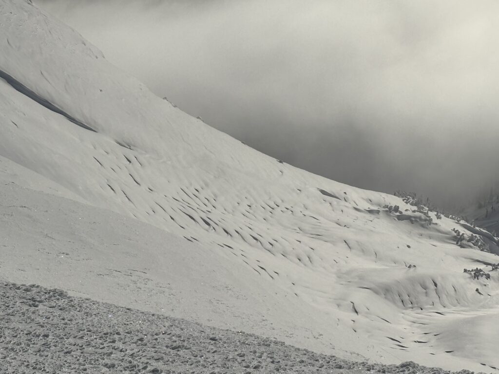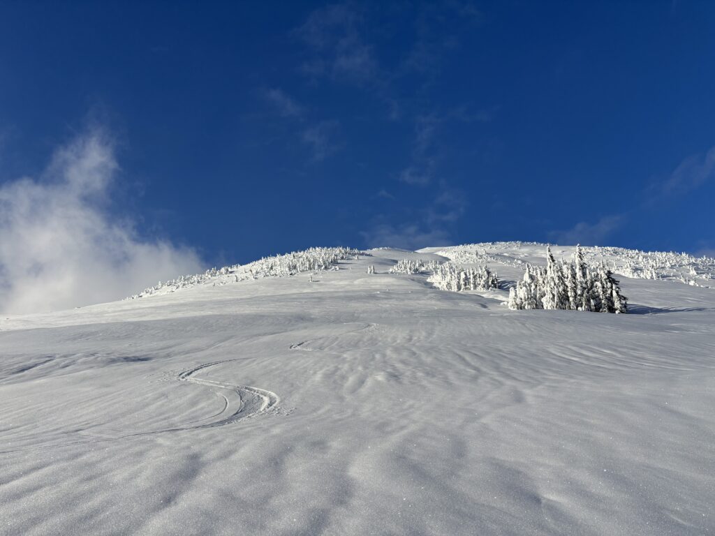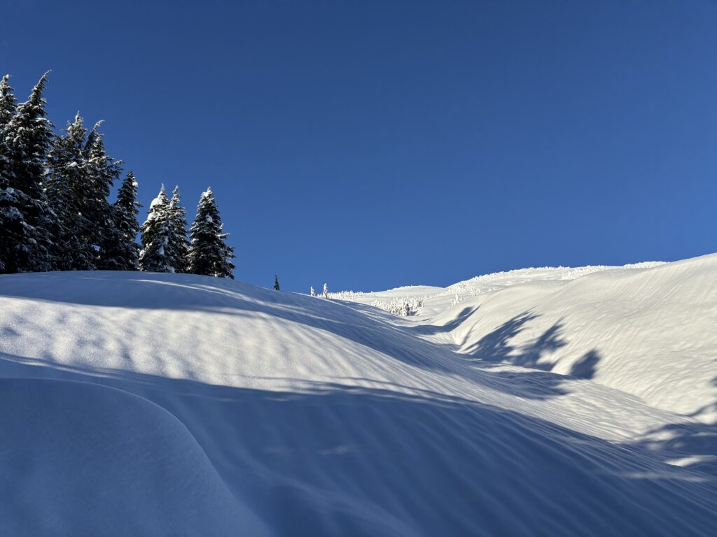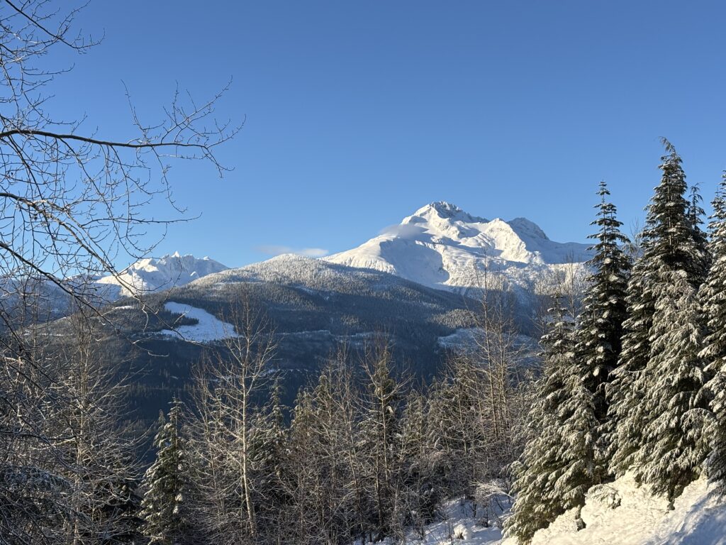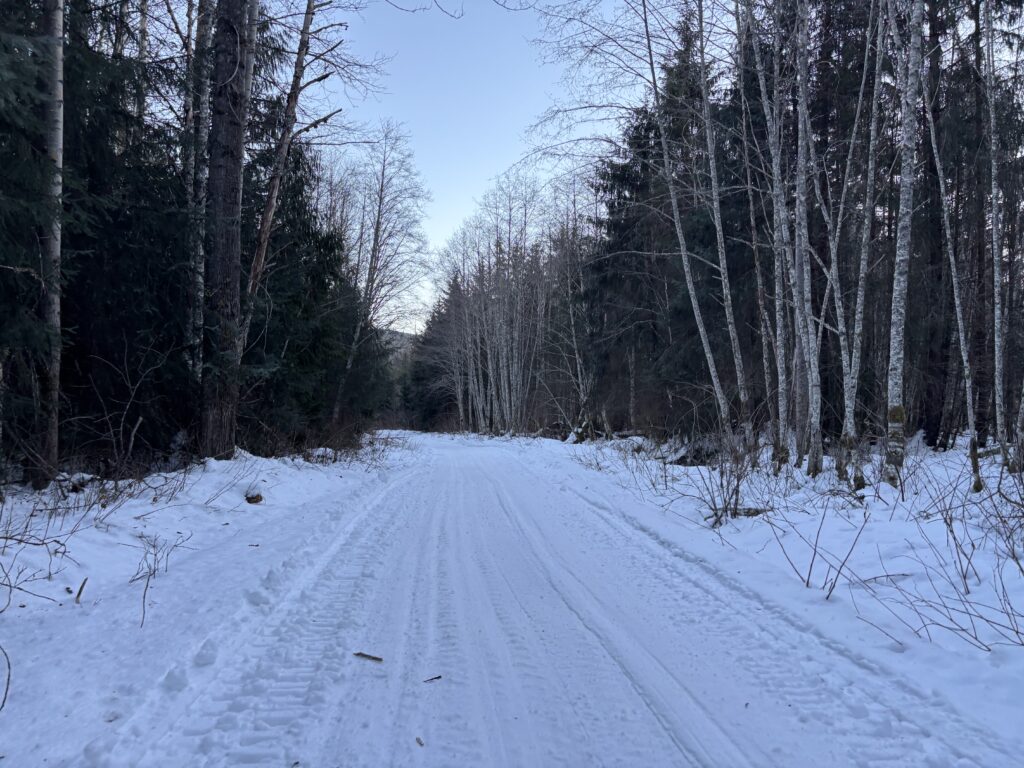 As I reached the start of Meadow Mainline I was surprised to round the corner and see a fully plowed pullout. A quick survey of the scene revealed this was a regular haunt for snowmobilers from Terrace and at least some part of the road I was about to skin up was graded and maintained. I laughed a bit thinking of how prepared I had come for a somewhat remote experience. In hindsight it should have been obvious, but that’s how it goes when you are learning an area.