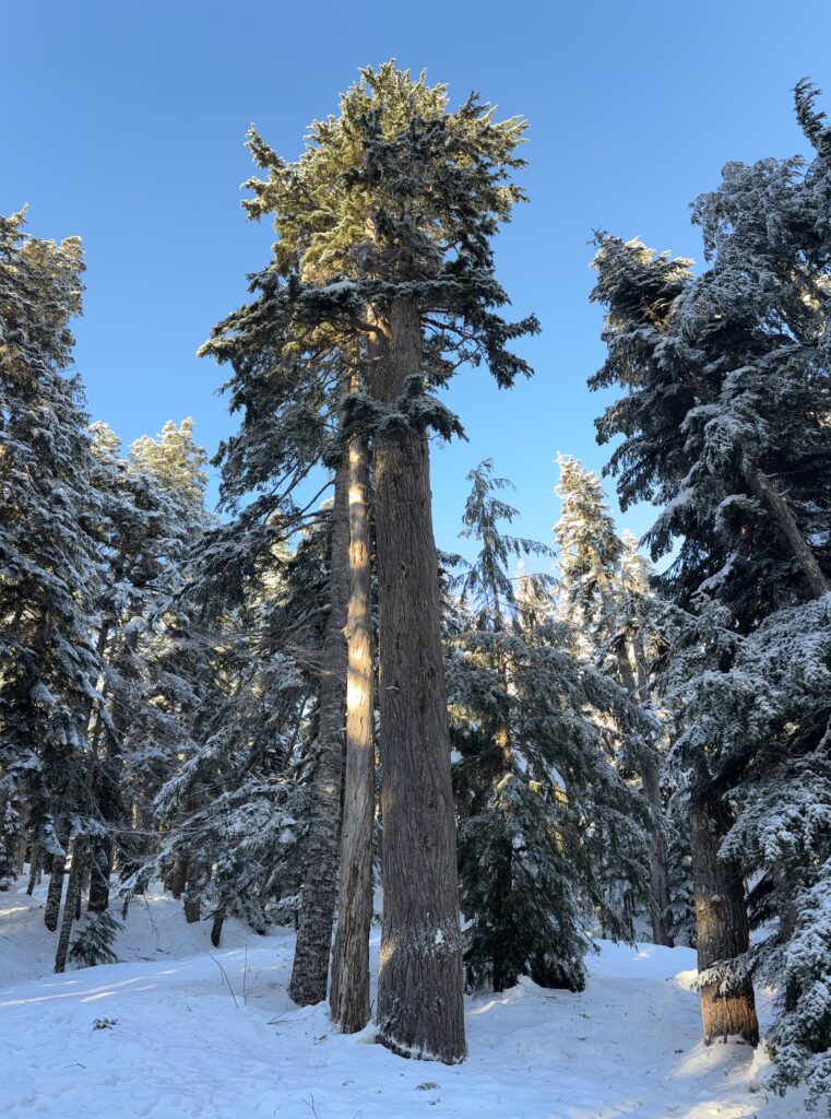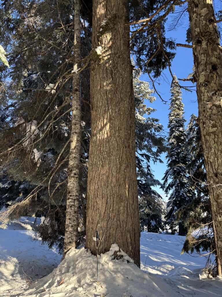 Two riders appeared to be out on the trail already, but otherwise I had the place to myself. I started skinning down the road and after 3.5km or so my route veered off of the maintained section of road and up a spur. The snow had a firm crust and made for an easy ascent. I exited through a cutblock and found steep ice in the forest. Skinning was an injury waiting to happen so I booted up the steep icy slope and then returned to skiing on the open meadows above. From the cut block I weaved my way through open forest and among some giants (to me) spanning at least 130-150cm in diameter.