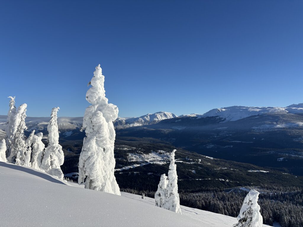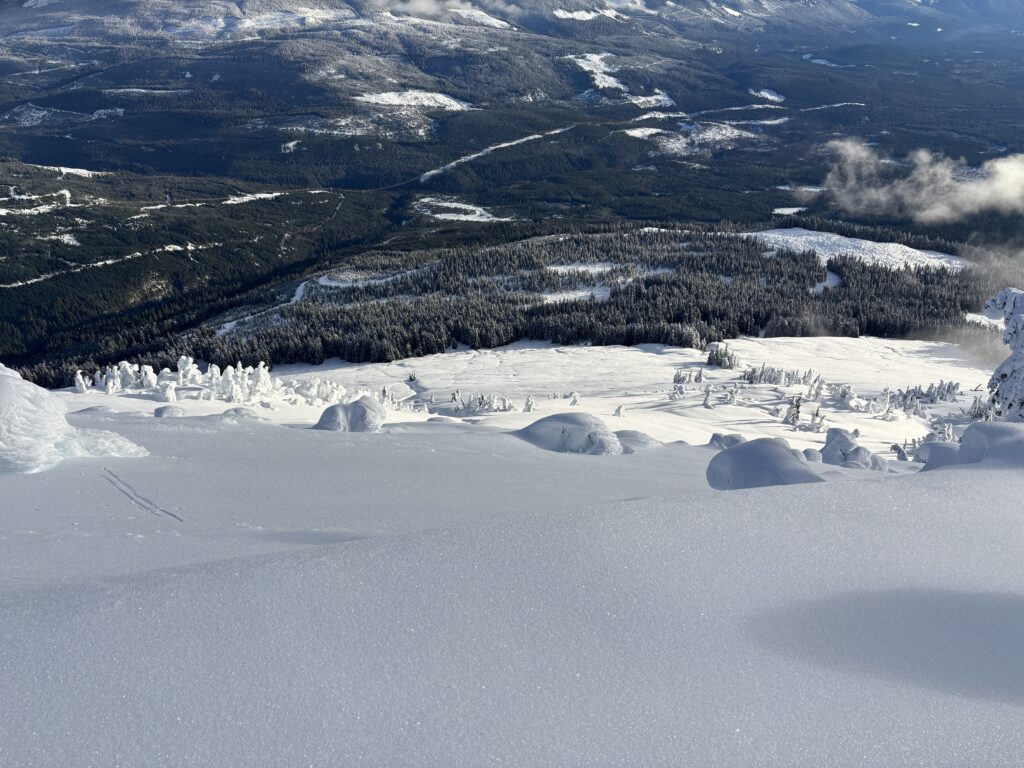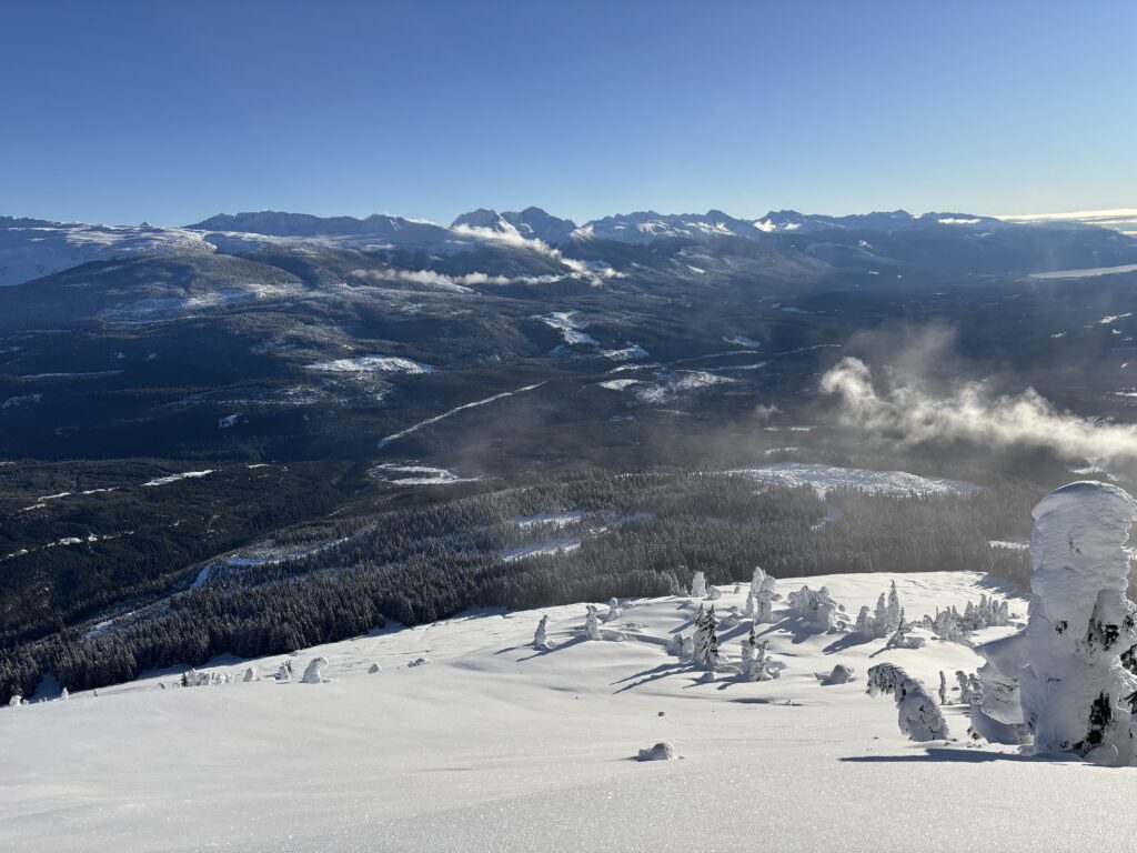 Satisfied with my surveillance of the area, it was finally time to return. The first 300m of descent were across icy rime bumps and feathers and was not all that pleasant, but big sweeping turns were had from there on out. Once I was on the road I had a speedy descent to the flat valley bottom below and skate skiied the flattest bit to the car. When I returned to the parking lot there was ~8 more trucks parked, but I never ran into a single person all day. I would imagine given the simple terrain and prominence above Kitsumkalum Lake that this peak is a regular ski touring attraction and I can certainly vouch for it’s enjoyment!