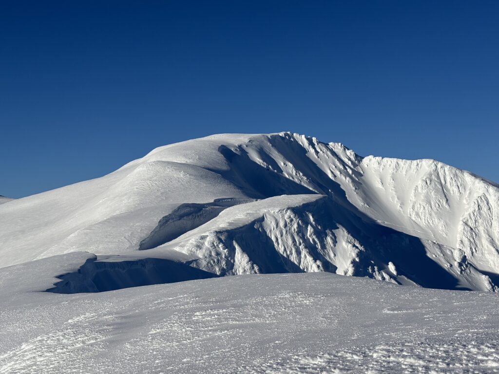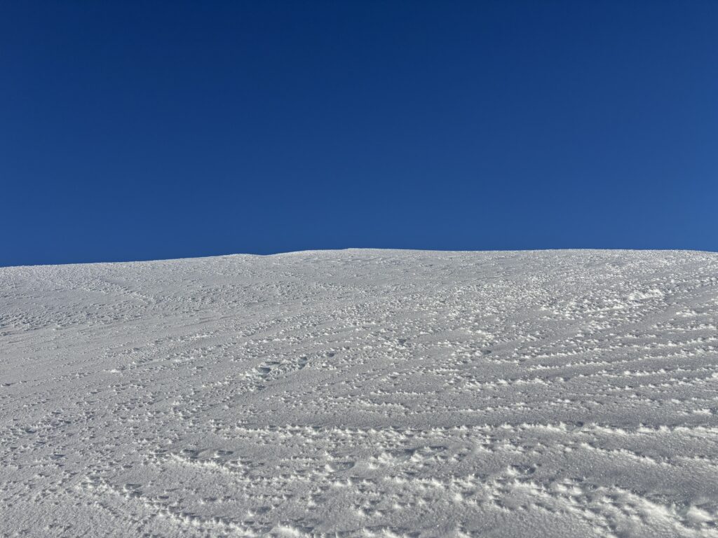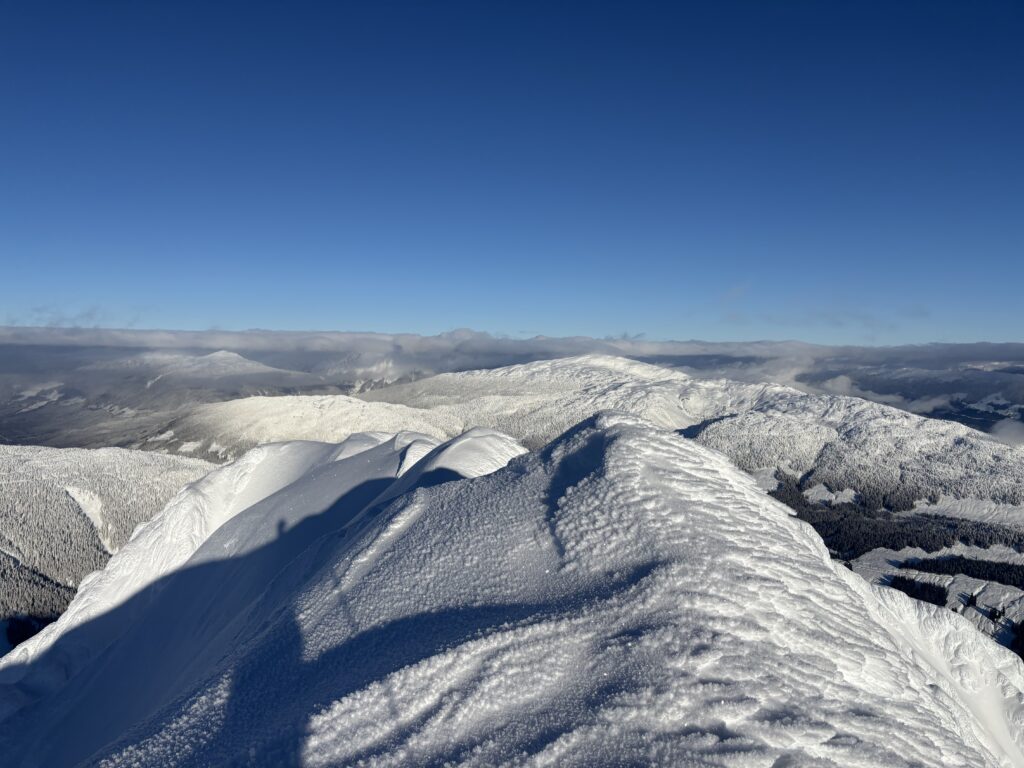 Above the forest was 800m of open meadows and slopes to gain. There was a wide spread layer of hoar frost on crust which promised some excellent skiing on the return. I slogged my way up to the ridge and from there I had my first view of the summit. It looked absent of any difficulties and I pressed onto to the top. The summit was devoid of any wind and I had the expansive vista to myself.